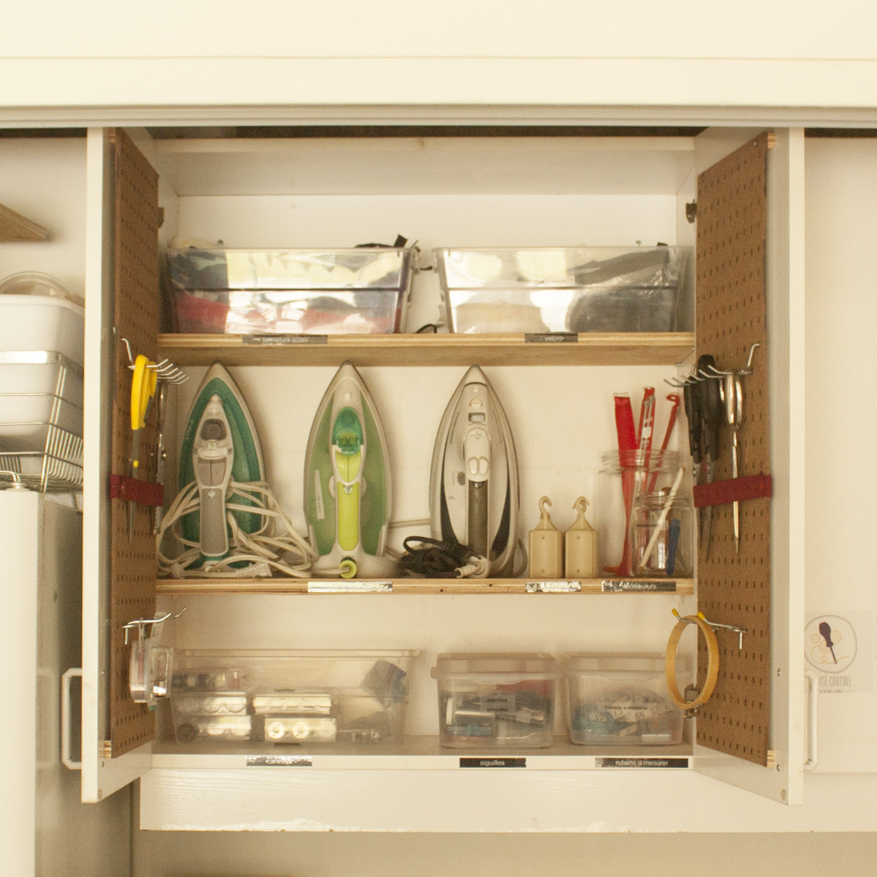 Les accessoires de couture sont rangés dans les armoires marquées du logo de l’atelier. Chaque article y est identifié afin de faciliter la recherche et le classement.